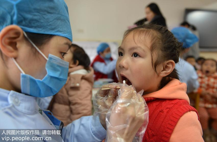 在安徽省合肥市宿州路幼兒園,醫生為孩子檢查口腔並給牙齒涂抹氟保護膜。(葛傳紅/人民圖片)