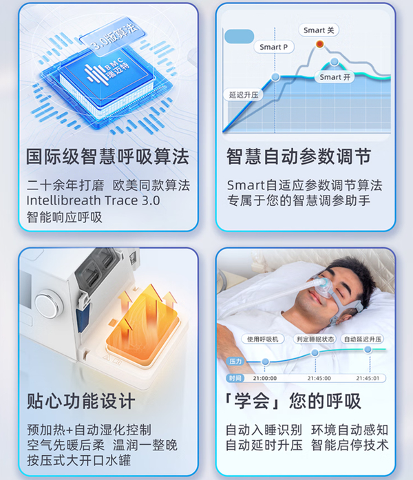 国际级智能呼吸算法(能准确识别一般算法难以识别的中枢性呼吸暂停)、智慧参数调节、云端智能(手机可连接查看和数据解读)、低噪音多级降噪技术、五年质保。
