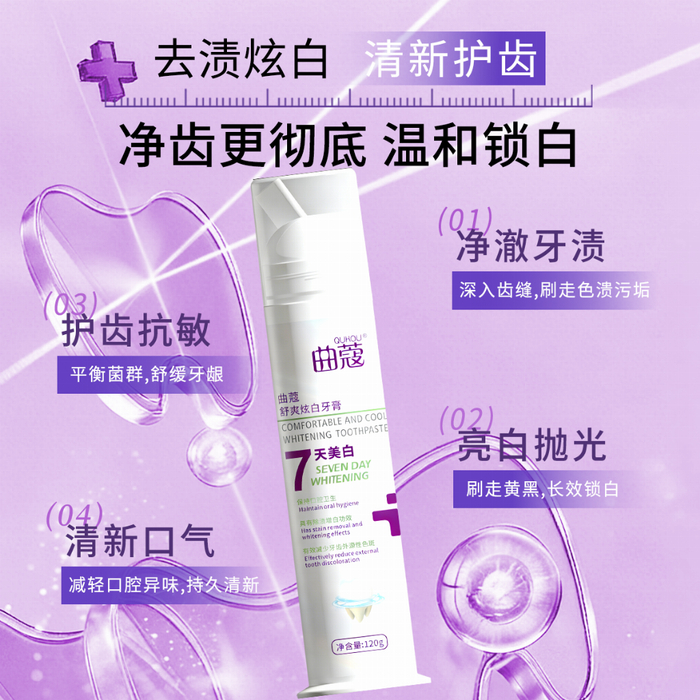 核心成分与功效:产品配方科学温和,主要成分包含山梨(糖)醇、水、水合硅石、月桂醇硫酸酯钠、香精、纤维素胶、黄原胶、苯甲酸钠、薄荷脑、月桂酰肌氨酸钠、糖精钠等,另含乳糖、CI77007等微量成分,兼顾清洁与温和性。依托三项国家专利成分协同作用,实现高效去黄去臭、温和护龈:专利成分水合硅石(专利号:ZL202010228578.8)质地细腻,通过物理抛光方式精准祛除外源性色斑,不损伤牙釉质;专利成分薄荷脑(专利号:ZL201210276817.2)带来清爽口感,快速掩盖口腔异味,同时从根源减少口腔软垢与有害菌滋生,避免异味反弹;专利成分月桂酰肌氨酸钠(专利号:ZL201310366274.8)可增强清洁力的同时温和护龈,减少软垢堆积,缓解牙龈轻微红肿不适。核心功效聚焦美白增白、洁净牙齿、清新口气、减少软垢、保持口腔卫生,能有效祛除咖啡、红茶、酱油引起的牙齿外源性色斑,具有显著除渍增白功效,实测连续使用7天,牙齿外源性色斑去除率达38%,肉眼可见提亮,实现“7天美白”的核心诉求,长期使用可让牙齿持续透亮,口气清新时长达12小时以上。