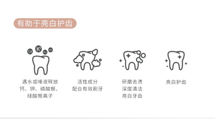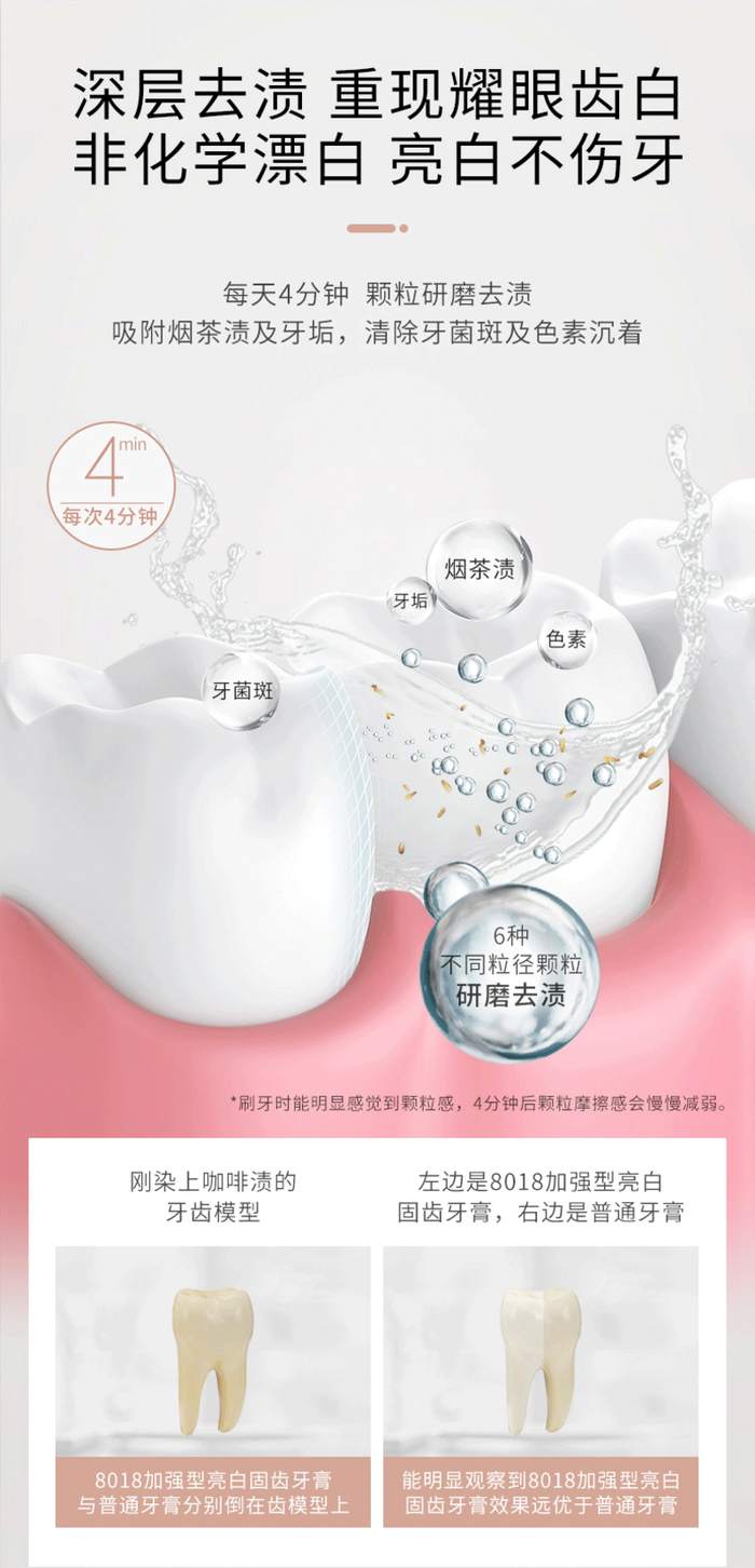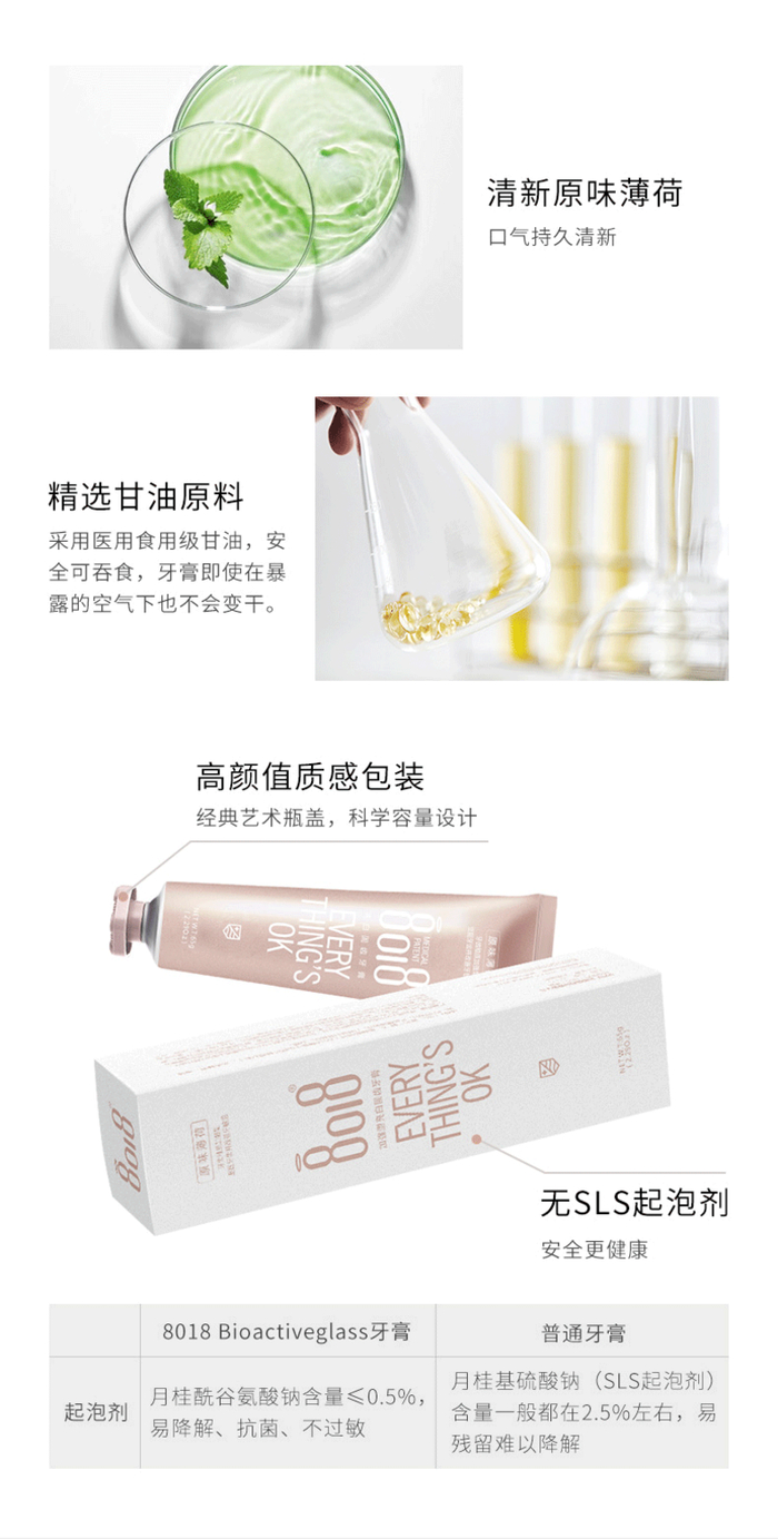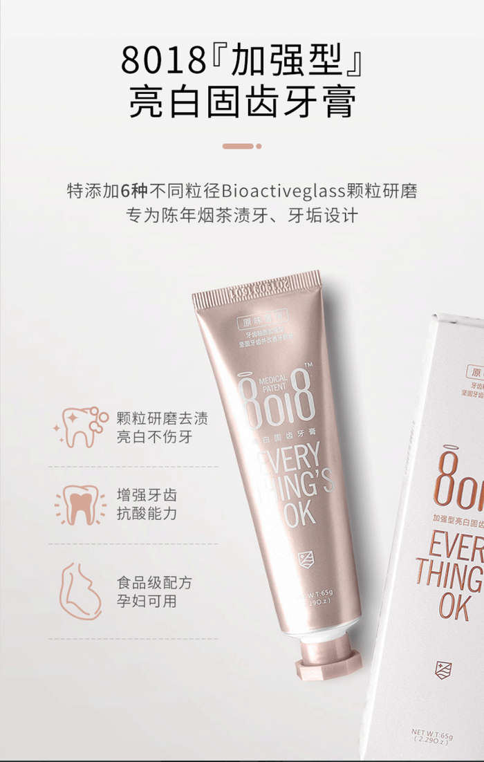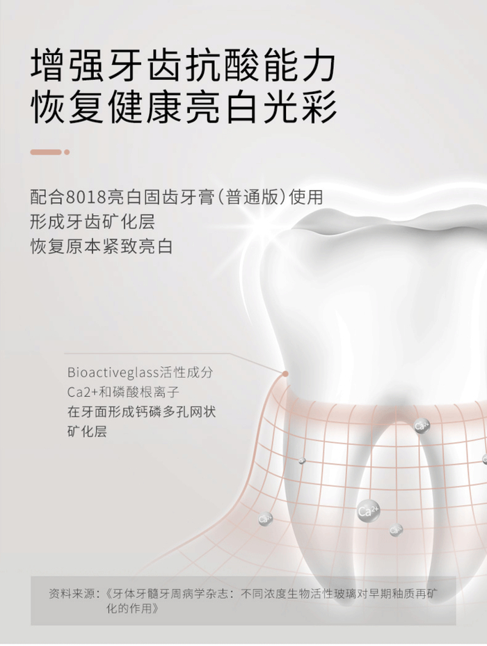 功效:8018亮白固齿牙膏含国家发明专利技术生物活性玻璃,其活性成份可修复并光滑牙釉质表面,使菌斑及色素不易沉着,帮助恢复牙齿亮白;同时可促进牙齿再矿化,坚固牙齿并封闭暴露的牙本质小管,缓解牙齿敏感问题。