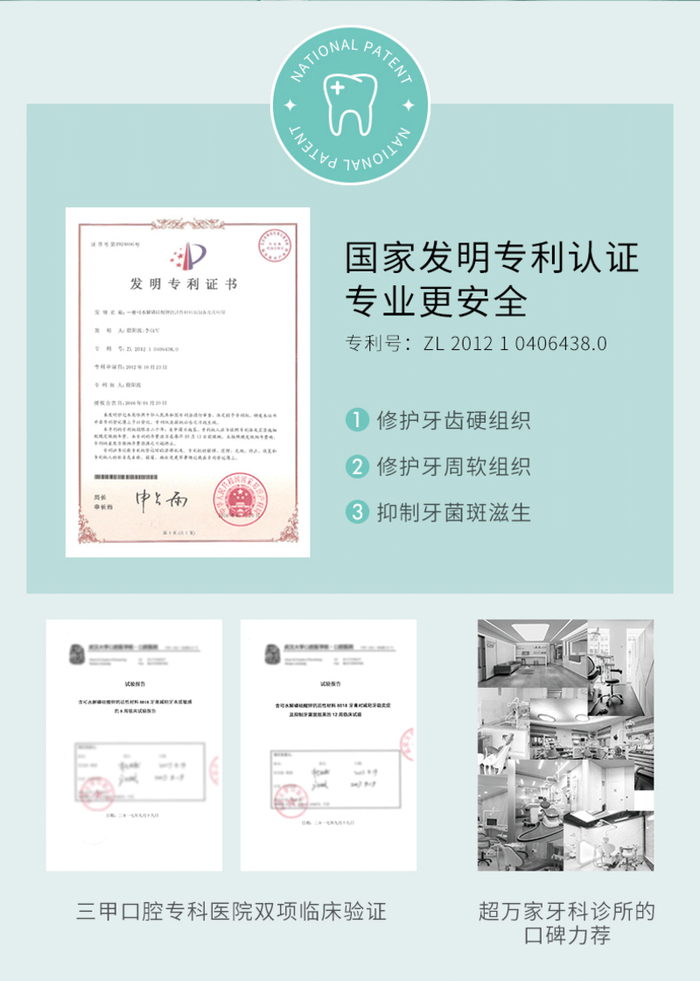 成分:甘油,聚乙二醇-8,磷硅酸钾钙 (8018新型发明专利生物活性玻璃),水合硅石,二氧化钛,卡波姆,乙酰磺胺酸钾,薄荷香精,月桂酰谷氨酸钠。