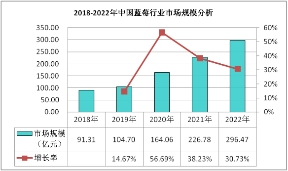 市场规模方面,据统计,近年来我国蓝莓市场规模不断增长,截至2022年我国蓝莓市场规模为296.47亿元,同比增长30.73%。
