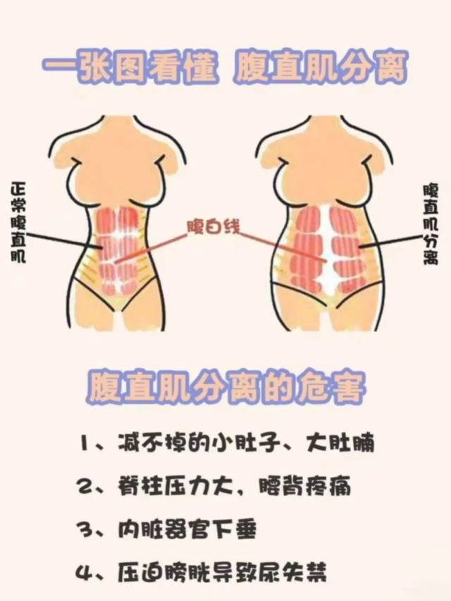 腹直肌分离就是指怀孕、肥胖等因素导致腹壁过度拉伸,腹白线变薄变宽,左右腹直肌之间的距离异常增宽。这件“紧身衣”的中间纽扣(腹白线)被撑松了,两片肌肉就分开了。