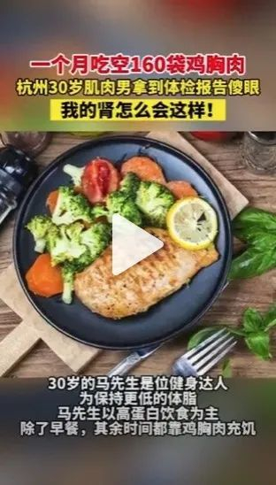 30岁的马先生是位健身达人,为保持更低的体脂,马先生听从健身爱好者的建议,以高蛋白饮食为主,一个月吃空160袋鸡胸肉。马先生觉得浑身无力,体检发现尿蛋白2+。医生判断他是因摄入过多蛋白质而造成肾脏代谢负担过重,继而导致肾损伤。